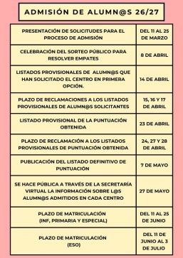 El plazo de presentación de solicitudes para el proceso de admisión del curso 2026-2027 será del 11 al 25 de marzo del 2026 (ambos inclusive).